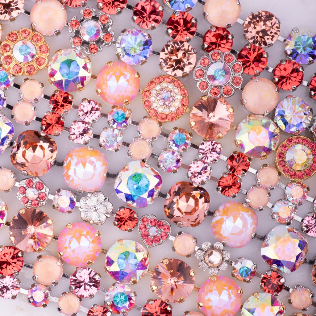 - Color 262-3: Sunset Drive-In from The In a Mod Mood Collection featuring Padparadscha, Light Rose, Sun-Kissed Peach and Clear Aurora Borealis.